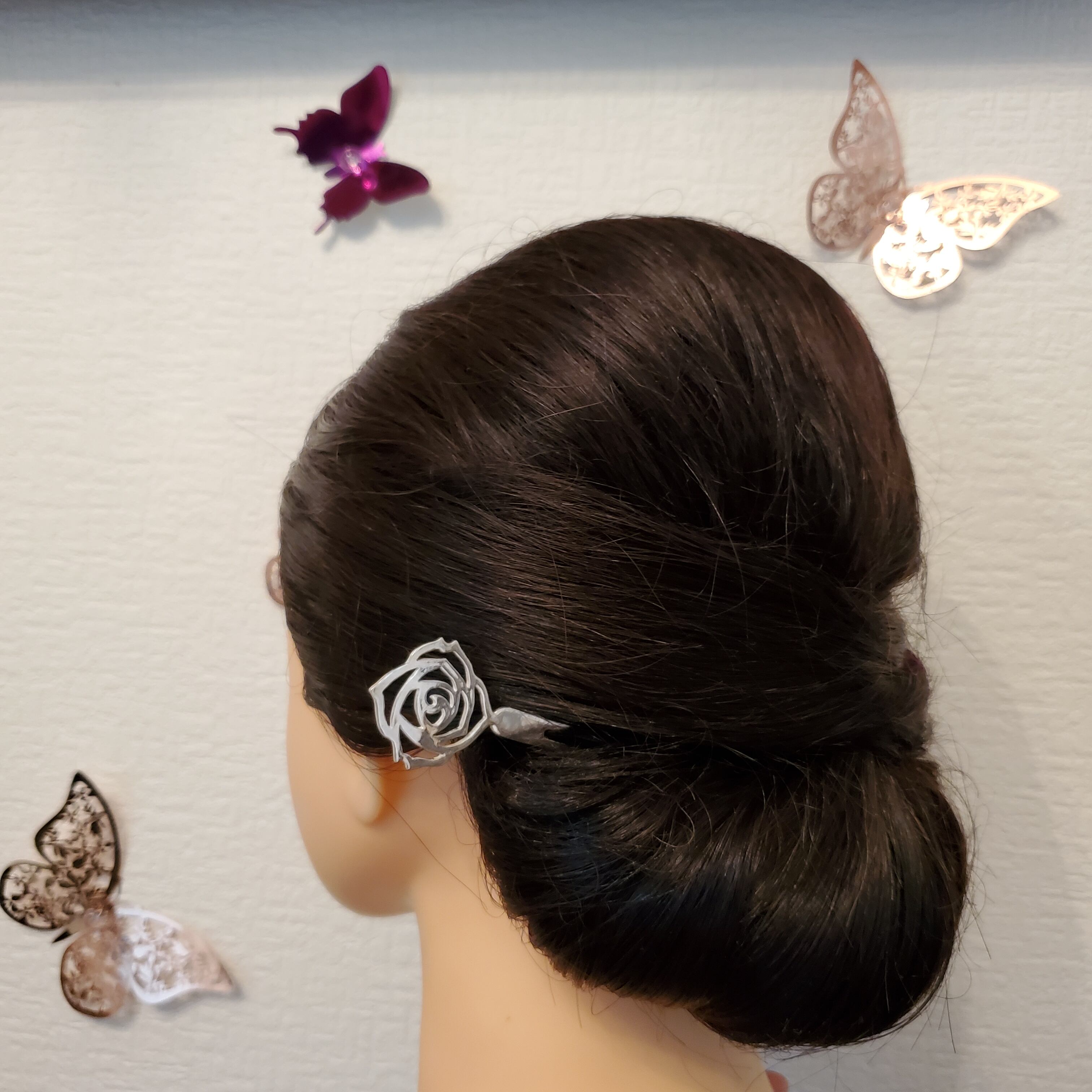あくまでも髪型が完成した後に、最後の【飾り】として、髪に挿してください。髪色と同じ10㎝~20㎝の糸でかんざしとヘアーピンをつないで、髪から抜け落ちるのを防いでください。
