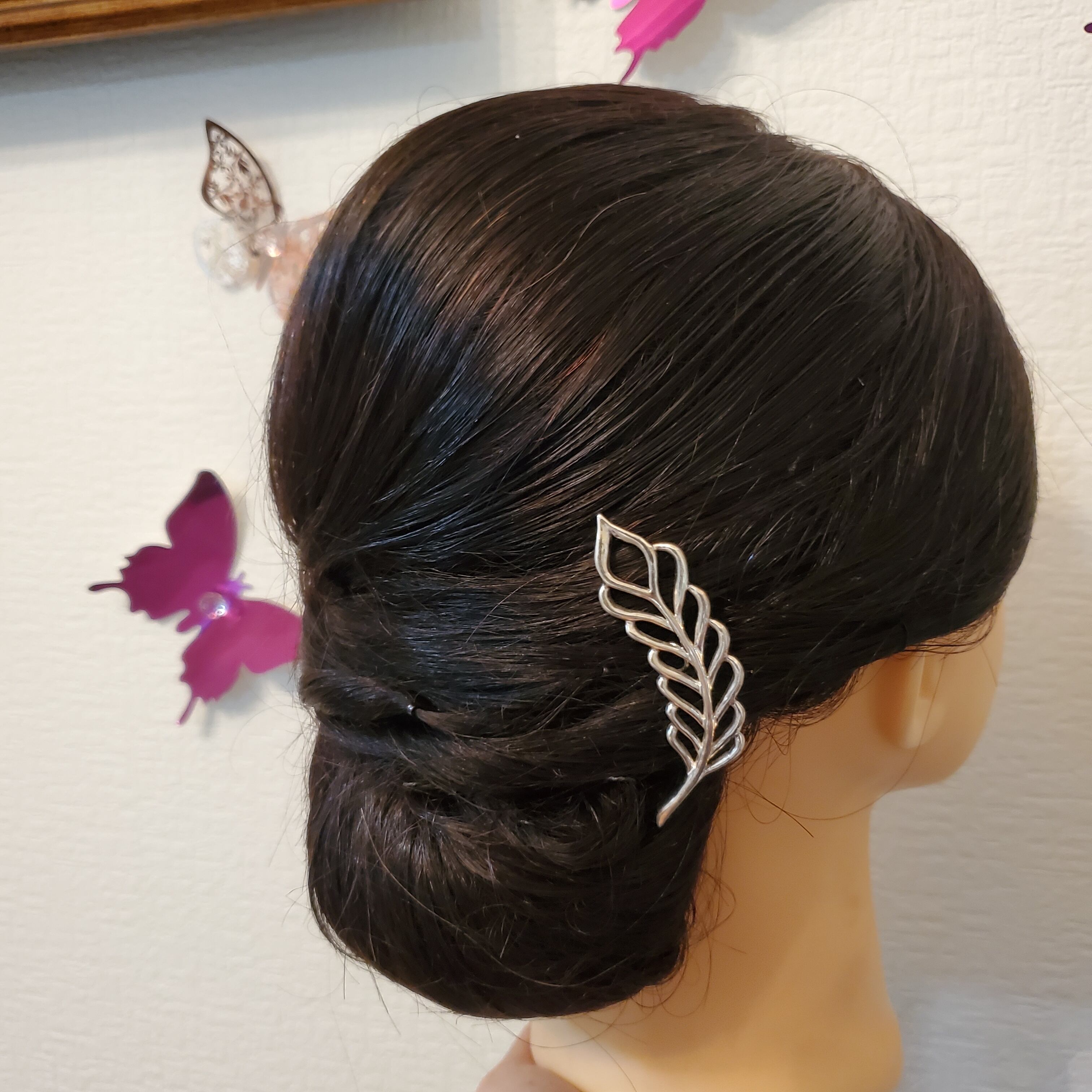 あくまでも髪型が完成した後に、最後の【飾り】として、髪に挿してください。髪色と同じ10㎝~20㎝の糸でかんざしとヘアーピンをつないで、髪から抜け落ちるのを防いでください。