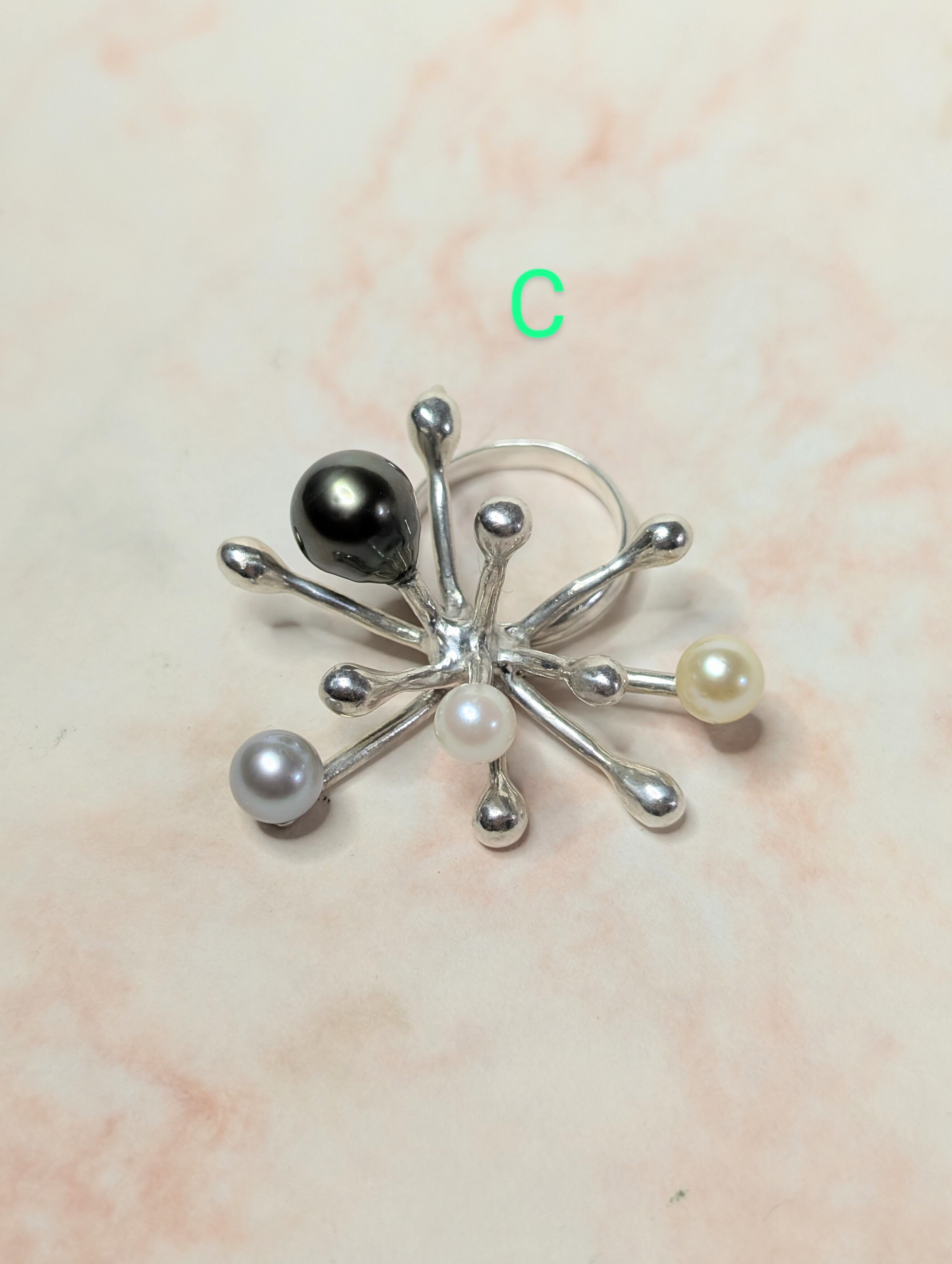 アコヤ真珠3つに中央付近に1つ、大きめの不揃いの南洋真珠を使っています。今回は、パールの組み合わせをA〜Cの写真で選んで、ご自身のリングサイズは、備考欄に入力してご注文くださいね!※メインの南洋真珠は、イエローまたは、ブラックを選択してください。