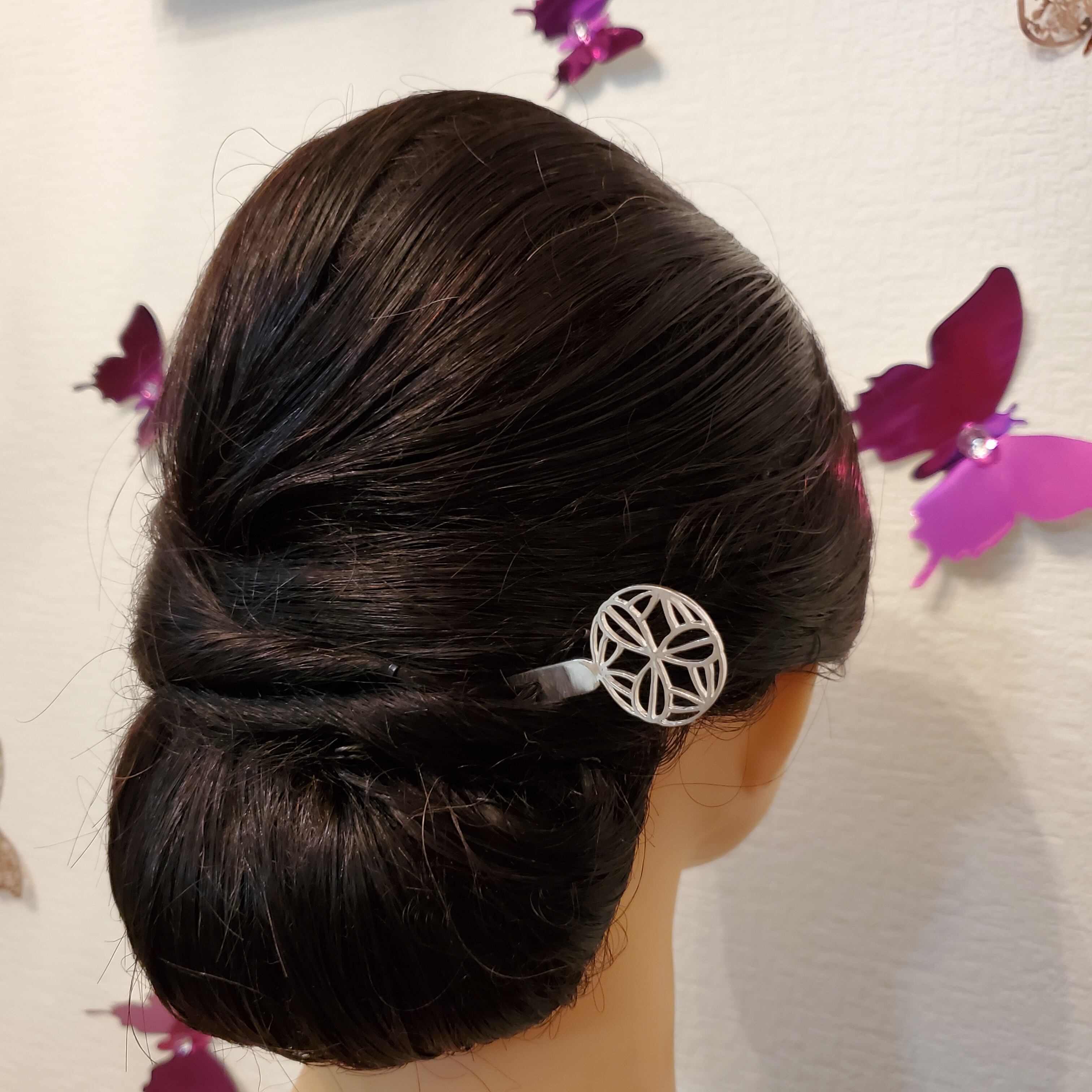あくまでも髪型が完成した後に、最後の【飾り】として、髪に挿してください。髪色と同じ10㎝~20㎝の糸でかんざしとヘアーピンをつないで、髪から抜け落ちるのを防いでください。